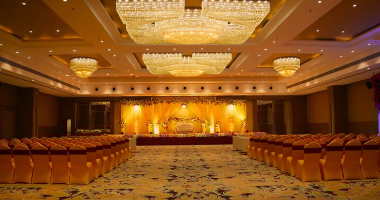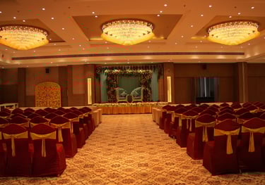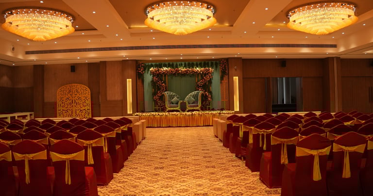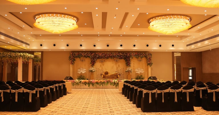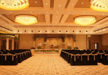 Key features: Large AC banquet, elegant stage area, flexible seating layouts, high ceiling for premium décor.